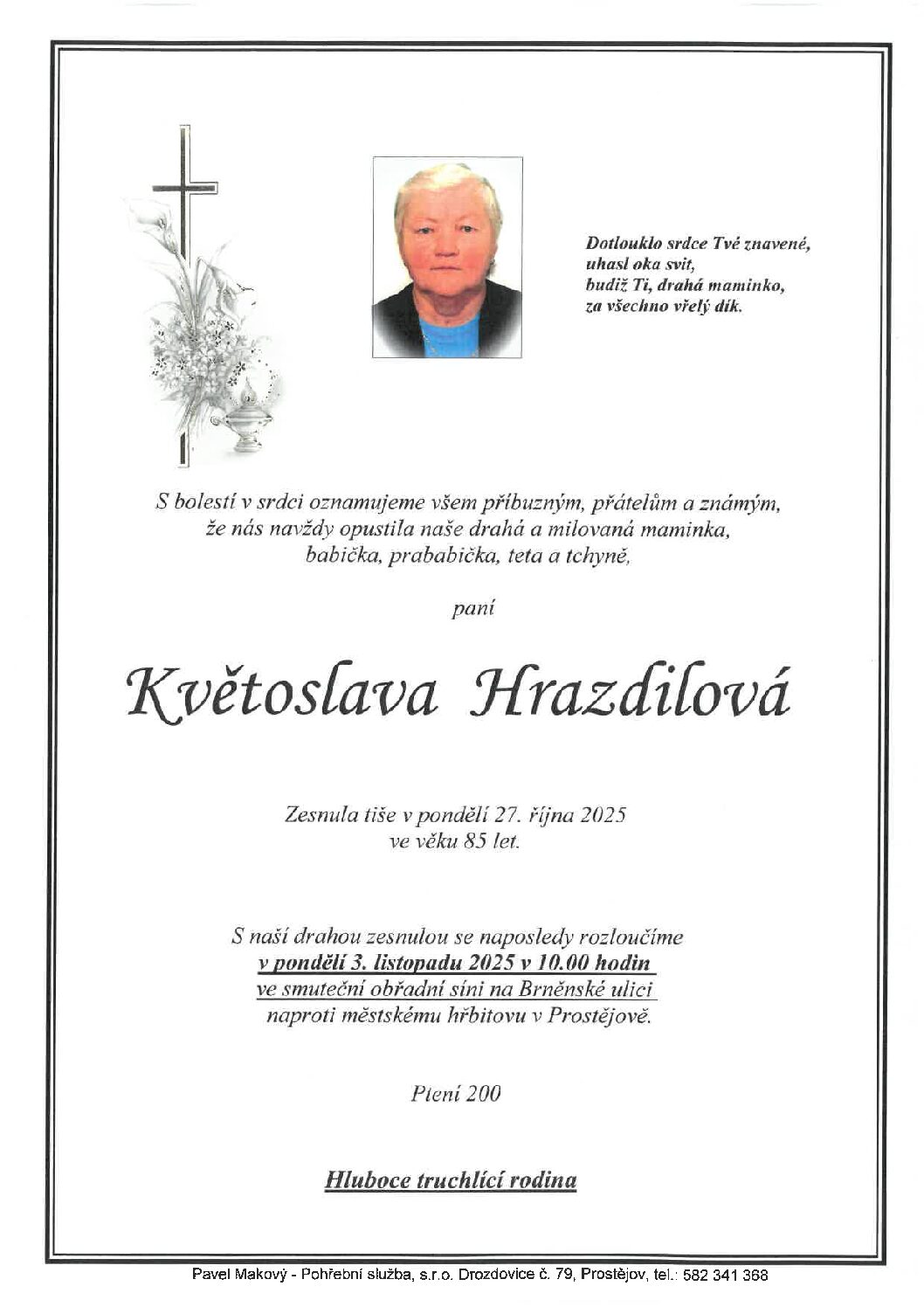 pondělí 3.11.2025 v 10.00 hodin OS Brněnská104, kremaceČíst více