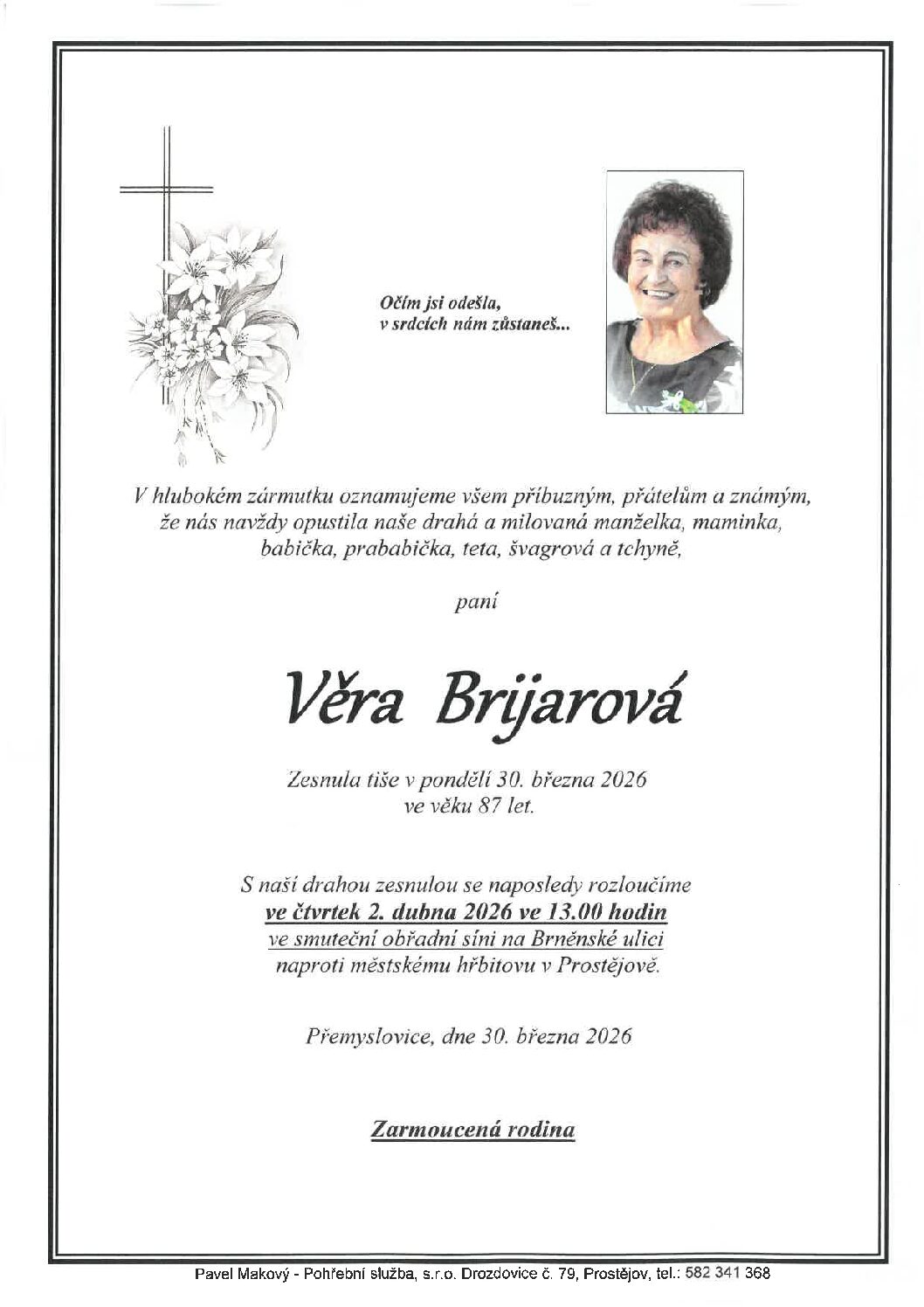 čtvrtek 2.4.2026 ve 13.00 hodin OS Brněnská 104, kremaceČíst více