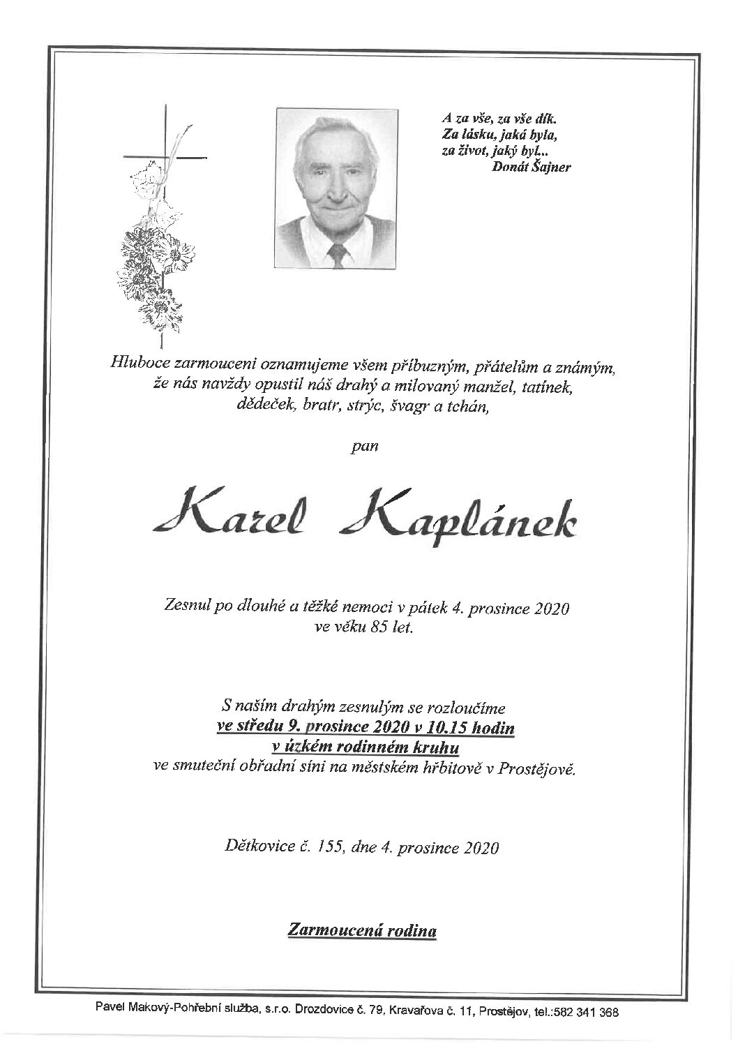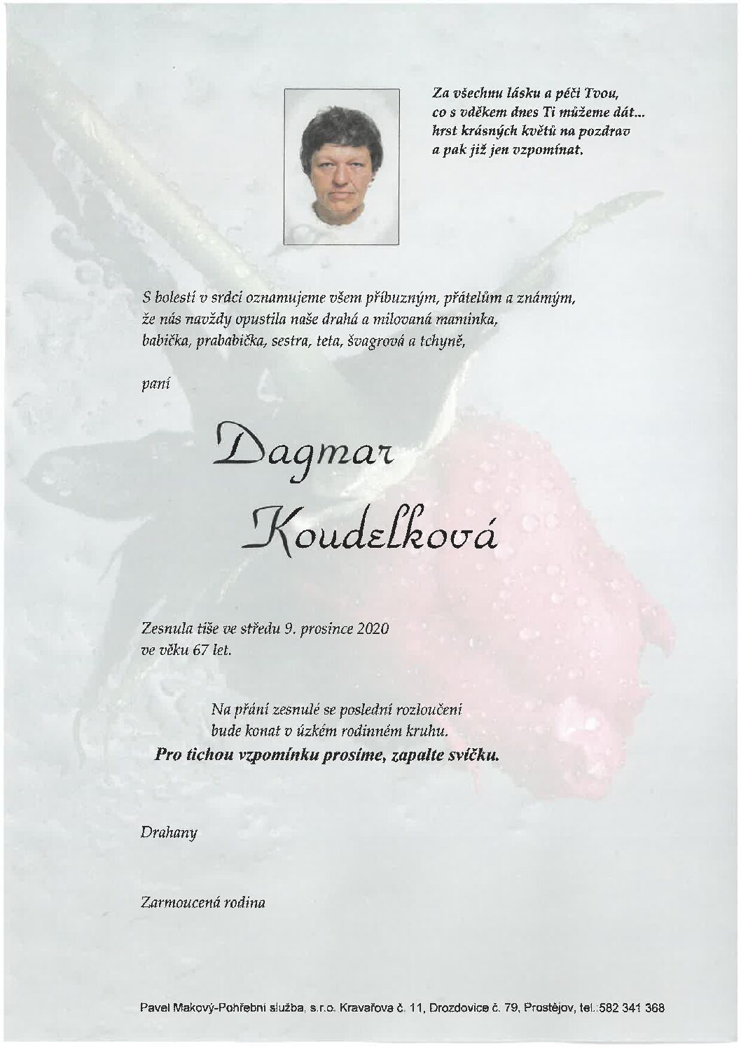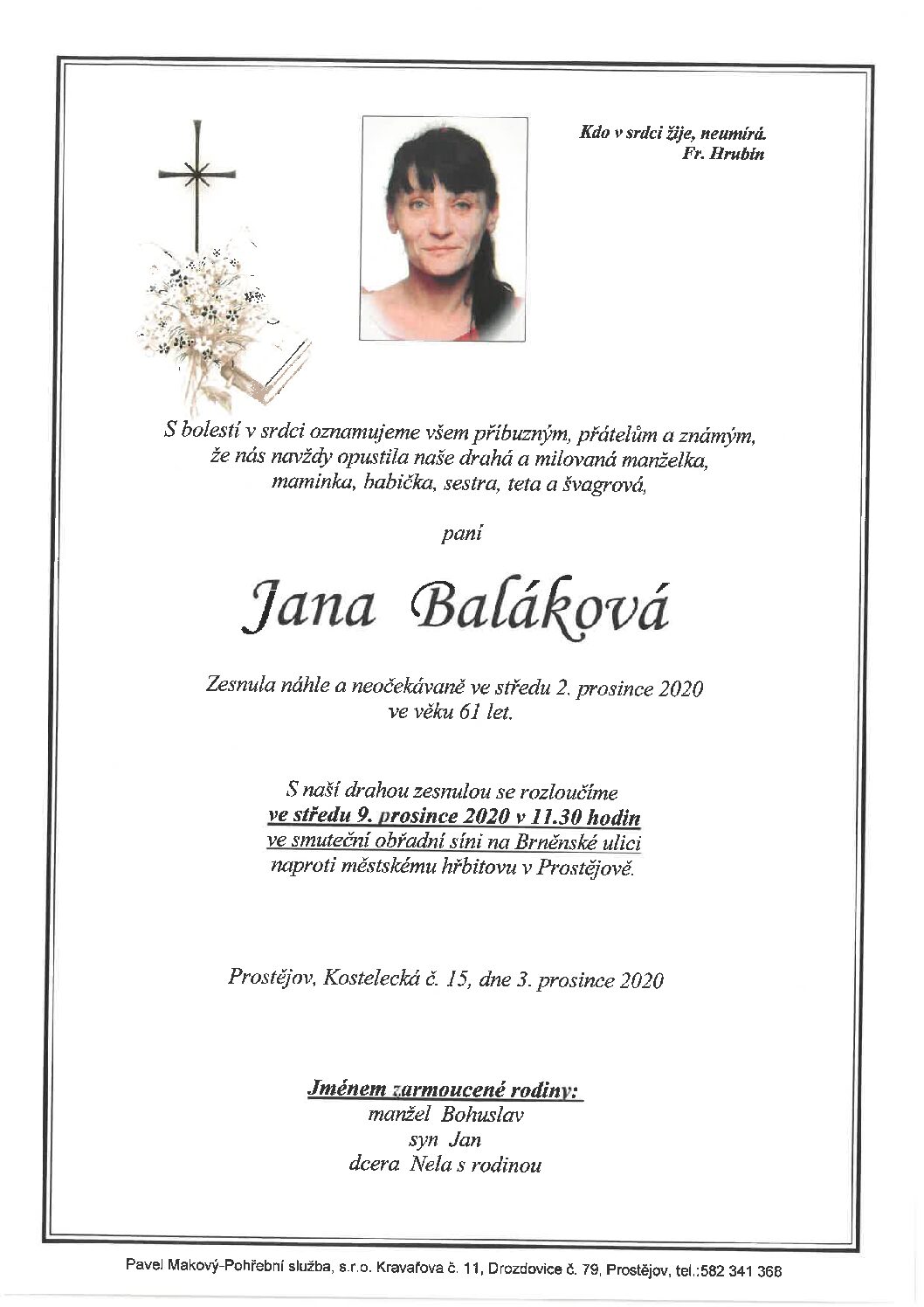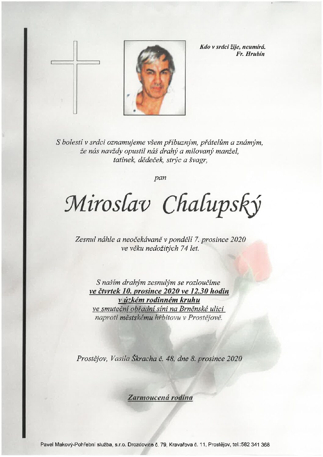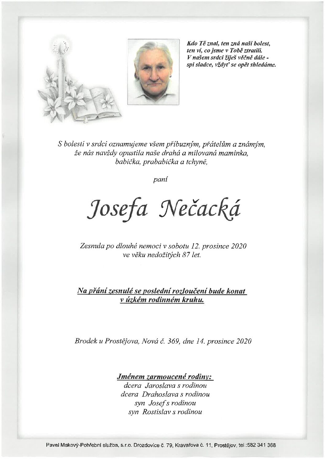 středa 9.12.2020 v 11.30 hodin OS Brněnská 104, kremaceČíst více